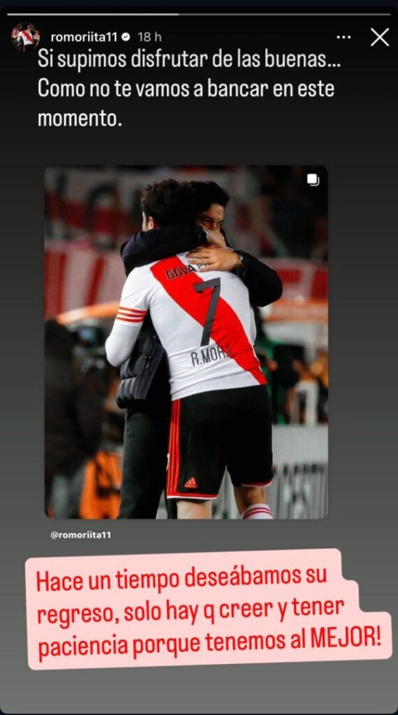 Fue Rodrigo Mora, el ex delantero que posteo en su instagram una foto junto al Muñeco con unas palabras para él: "Si supimos disfrutar de las buenas… cómo no te vamos a bancar en este momento" expresó y seguido a eso, abajo agregó: "Hace un tiempo deseábamos tu regreso. Solo hay que creer y tener paciencia porque tenemos al mejor".