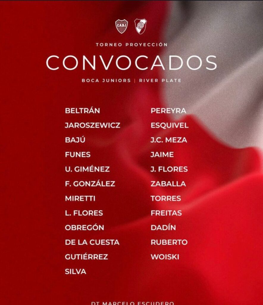 En la lista de convocados de Marcelo Escudero, el plantel suma varios jugadores que venían trabajando con la Primera: Jaime, Agustín Obregón, Agustín De la Cuesta, Facundo González, Agustín Ruberto y Joaquín Freitas. Junto a Dadín y Juan Cruz Meza, que hace tiempo volvieron a la Reserva tras su etapa con el equipo de Gallardo, serán titulares.