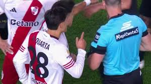 Un primer tiempo que solo dejó desgracias para River, ya que a comienzo del mismo, el primero en recibir una tarjeta amarilla fue Martinez Quarta a los 13 minutos, fue amonestado por una falta sobre Exequiel Zeballos, el defensor bajó al delantero con un empujón.